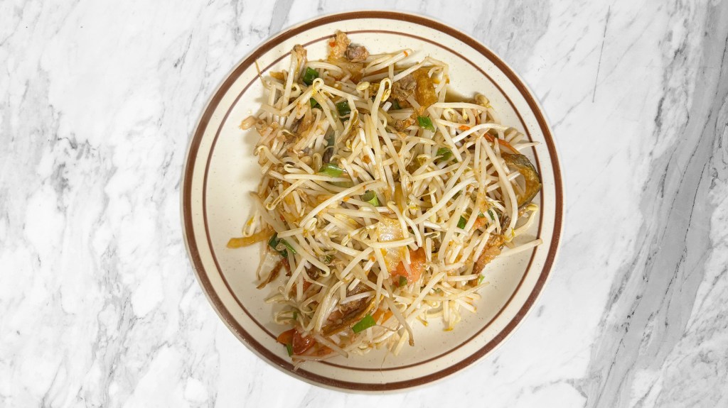 A simple yet flavorful stir-fry of crunchy bean sprouts tossed with savory shredded salted fish, creating a rustic balance of freshness and umami.