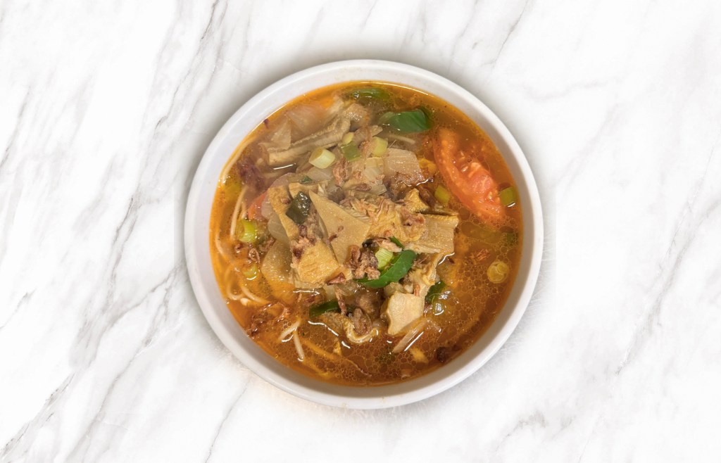 A vibrant spicy soup of tender tripe in a clear, aromatic broth, served with noodles and fresh vegetables for a hearty and flavorful West Javanese classic.
