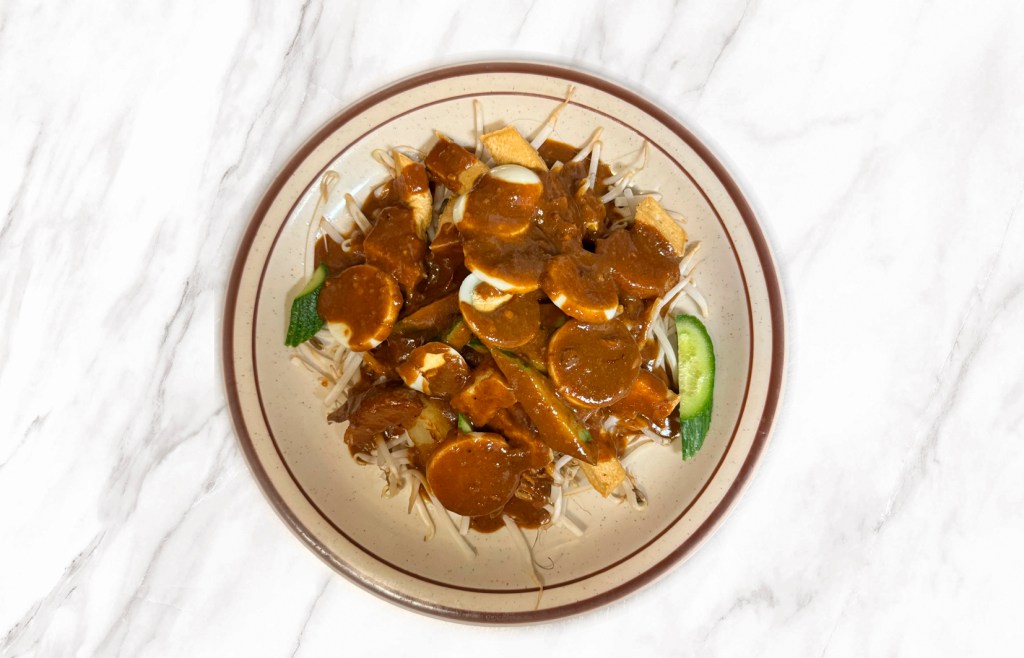 A classic East Javanese dish of fried tofu, rice cake, potato, bean sprouts, cucumber, and boiled egg, generously dressed in an East Java dark paste-peanut sauce (petis) for a hearty and satisfying street-style favorite.