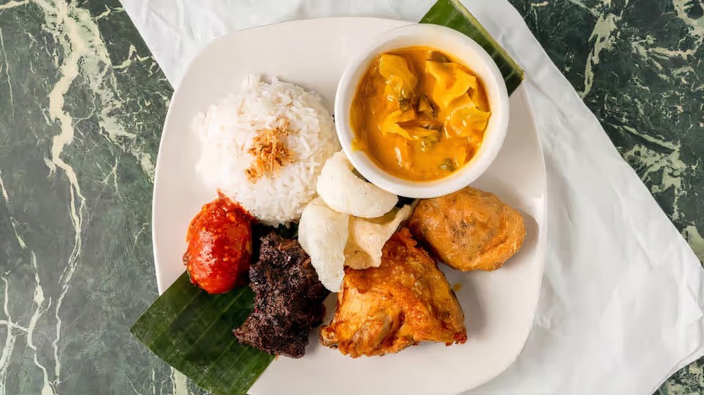 Steam rice, beef rendang, fried chicken, spicy egg, potato cake, veggie pickle and vegetable curry.